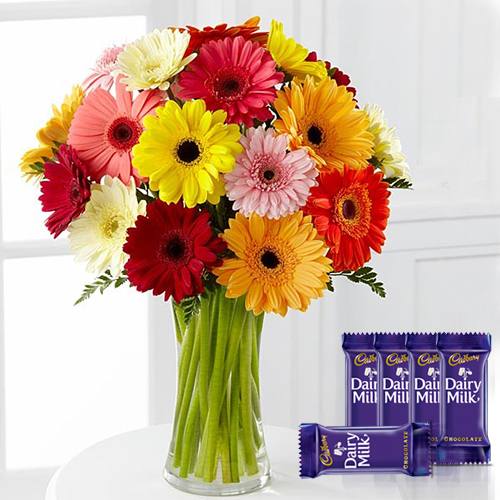 24 Gerberas in Vase along with 5 Dairy Milk of 12.5 Gms each.