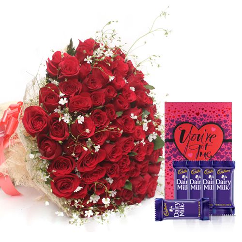 roses, 5 Cadbury Dairy Milk chocolates of 13 grams each, and a greeting card as