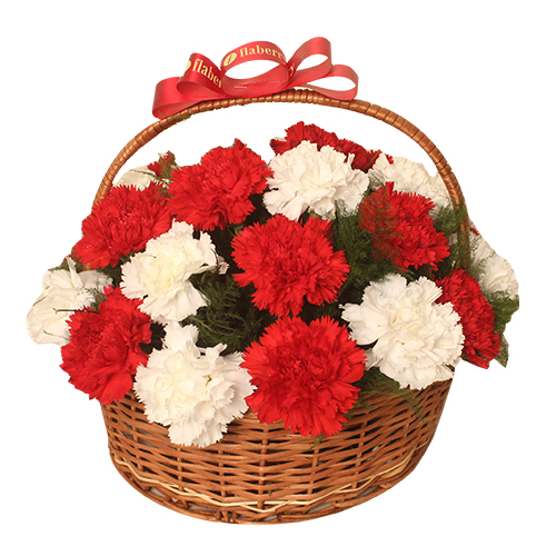 A basket Arrangement of 40 Carnations (20 Red and 20 White)