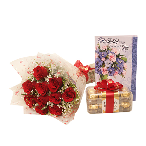 12 Red Roses in A Cellophane Packing with A greetings card (as per the Occasion) and Ferrero Rocher 16 PCS Box