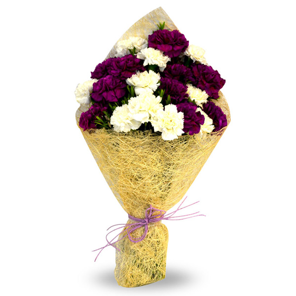 Some flowers are not meant to be given to just about anyone, & only truly special persons can claim to be the deserving recipient. Choose your pick among your loved ones and gift this amazing bunch of 10 white and 10 purple carnations in jute wrapping.
