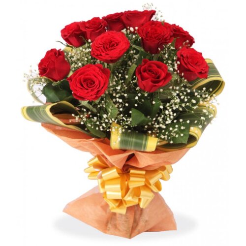 12 red roses with seasonal fillers in leaf packaging outside as shown.