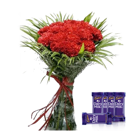 combo of 18 red Carnations & 16 Pieces Ferrero Rochers along with 5 Dairy Milk of 13 Gms