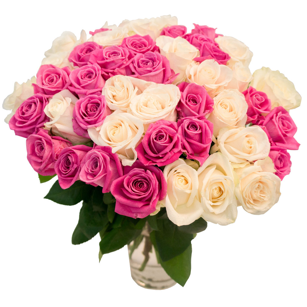 The product Contains: 20 Pink and 20 white roses in a glass vase arrangement