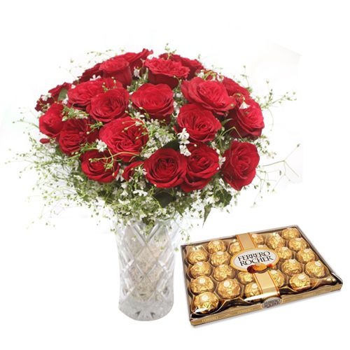 Rocher chocolates. The roses are beautifully arranged in a white vase and adorned