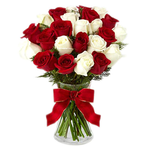 The combination of red & white never fails to make an impact, especially if we talk about roses. Gift this special bunch of 30 red & white roses with fillers in a beautiful glass vase to someone you love.