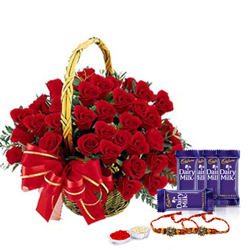 You may fight with your sibling year-long but on Rakshabandhan, you should shower them with love! The Fragrance Around - Rakhi & Dairy Milk Special collection featuring 30 red roses in a ribbon-wrapped basket, accompanied by roli chawal, 5 Dairy Milks of 13 Gms each and two rakhis is the perfect way to pamper your sibling!