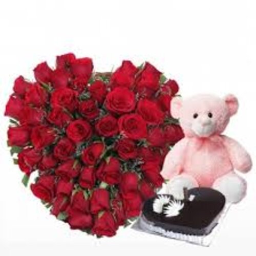 When you think of finding a gift for your beloved it has to be special and extraordinary. This emotive token of a loveable Teddy, a Heart-shaped arrangement of Red Roses and tempting chocolate will be cherished by them forever.