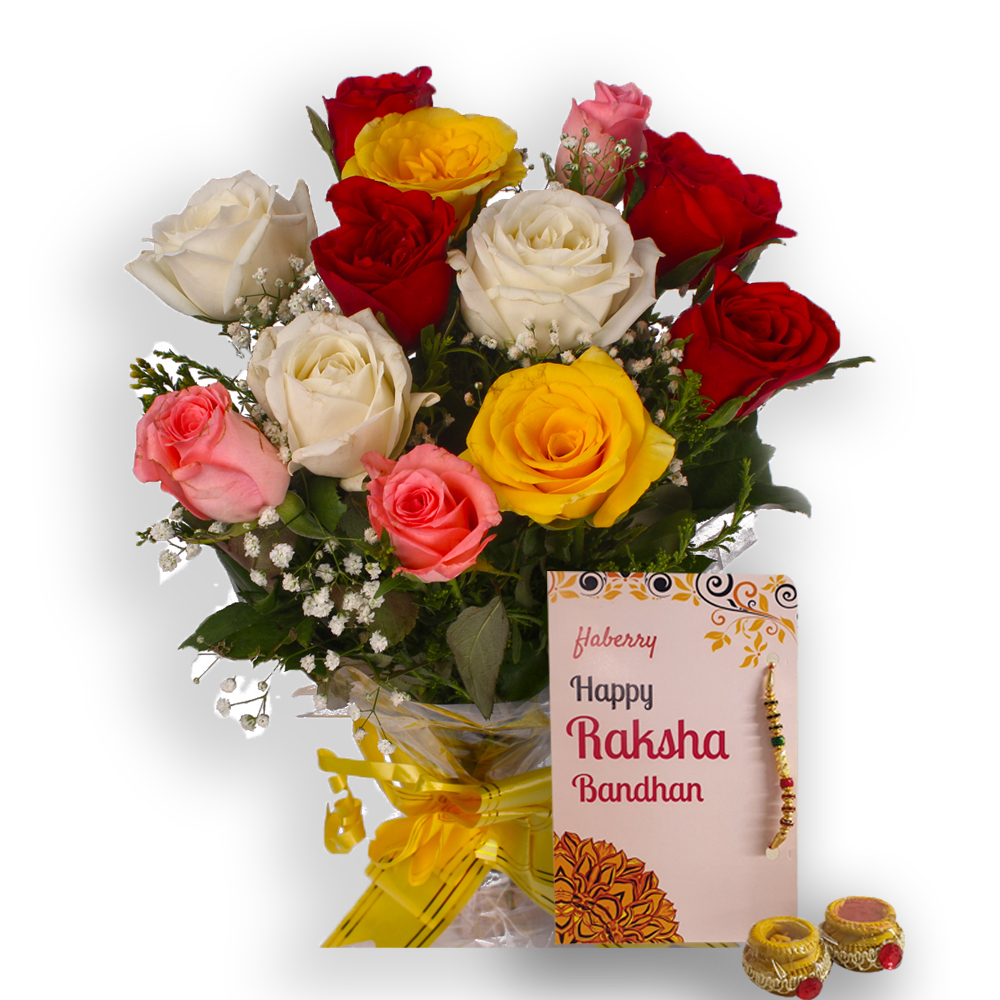 Send Your Brother a Beautiful Mixed Roses Bouquet and a Rakhi Combo on this Raksha Bandhan. Product Contains:10 Mixed Roses in Cellophane with Rakhi + Roli Chawal