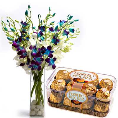Orchids are one of the most loved and mesmerizing flowers. Its intrinsic beauty and charm fascinate everyone. The majestic color combinations and freshness of the flower spread the air of love. The bunch is placed in a glass vase embossed with white pebbles. To surprise your loved ones this pack also offers a delicious Ferrero Rocher chocolate pack.