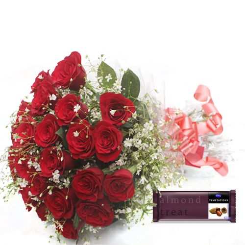 Promise your eternal love to that special someone with this exquisite Flaberry Promise Day combo. The combo comes with 36 sagacious and nature’s finest red roses along with one Cadbury Temptation chocolate. The roses are beautifully wrapped in cellophane paper and tied with a red ribbon. The bouquet is further adorned with white seasonal fillers. Order now!