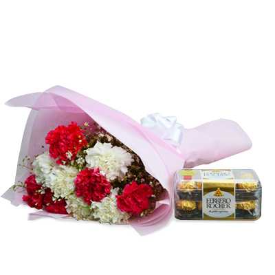 A carnation is from the species of Dianthus and is also known as the “flower of the gods”. Every carnation color has significance and history related to it. A Red Carnation signifies admiration and deep love and a White Carnation signifies pure love and good luck. Endow your loved ones with prosperity and happiness with this gorgeous bouquet of 6 Red & 6 White Carnations with Ferrero rocher.
