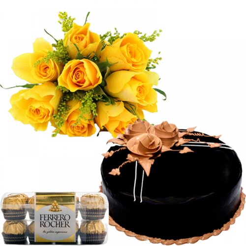 beautiful yellow roses, a half-kg chocolate cake, and a box of 16 Ferrero Rocher